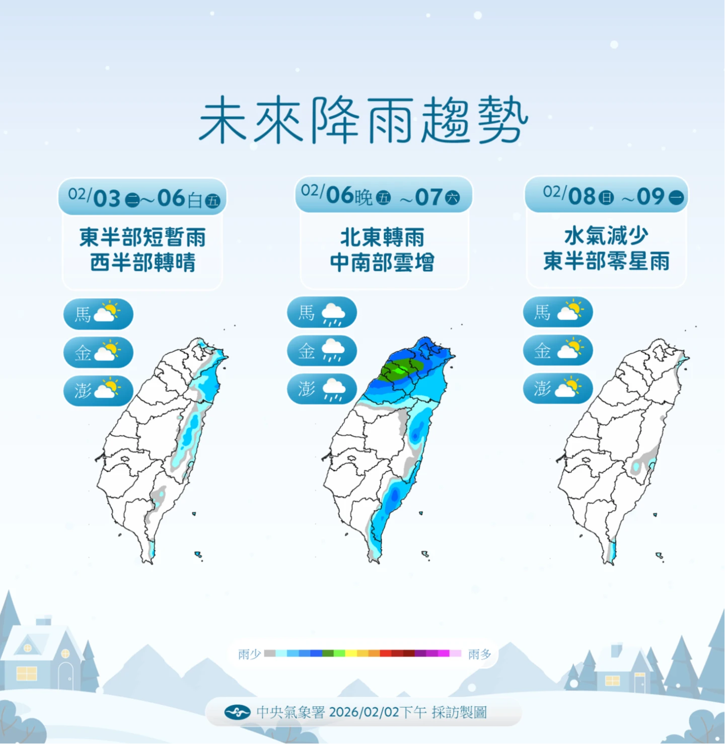 周三(4日)至周五(6日)白天好天氣,氣象署說,這段期間水氣減少,各地大多為多雲到晴,僅東半部有零星短暫雨。氣溫也會明顯回暖,北部及東半部高溫回升至19至24°C,中南部更可達21至29°C,但中南部日夜溫差大,早出晚歸仍需適時增減衣物。