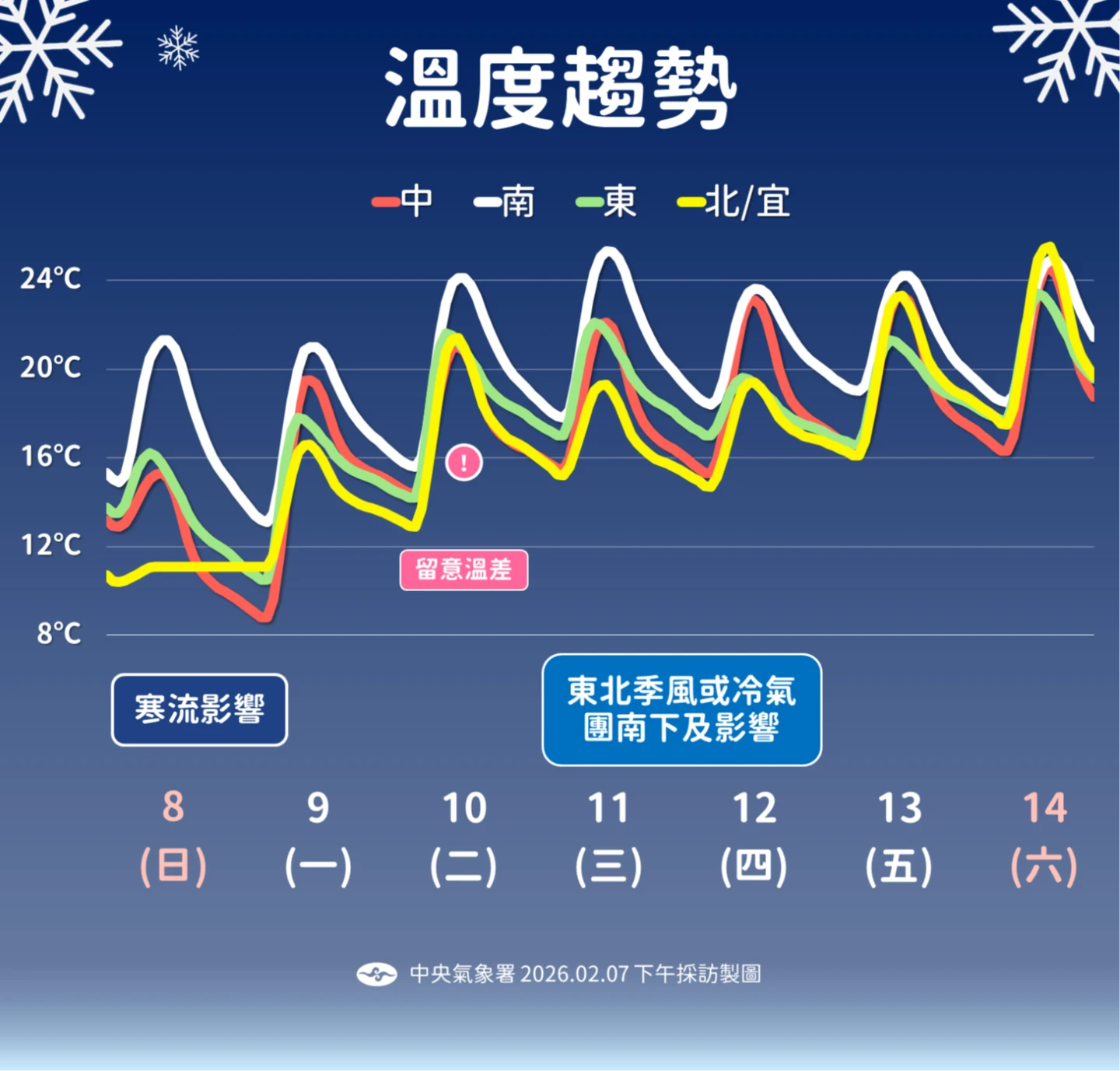 林得恩指出,周二(2/10)台灣各地氣溫短暫回升,由於輻射冷卻效應影響,早晚仍偏涼冷,中南部日夜溫差增大。另一波新的冷空氣再度南下會落在週三(2/11),目前評估,強度在東北季風增強與大陸冷氣團等級之間。吳德榮則強調,預計自13日本周五起(小年夜前夕)至17日(大年初一),各地將轉為晴朗穩定、回暖如春的天氣,但需注意日夜溫差大。