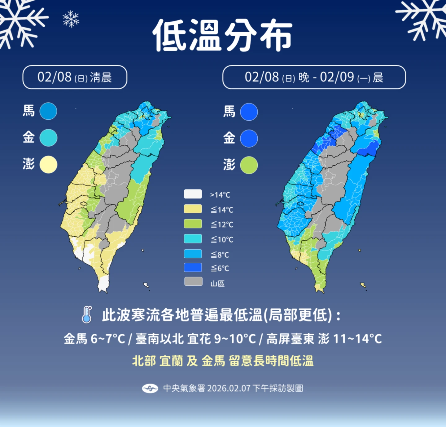 氣象署指出,寒流影響,今晨各地天氣非常寒冷。今日局部地區有持續10度左右或以下氣溫(橙色燈號)發生的機率,請注意防範。低溫區域: