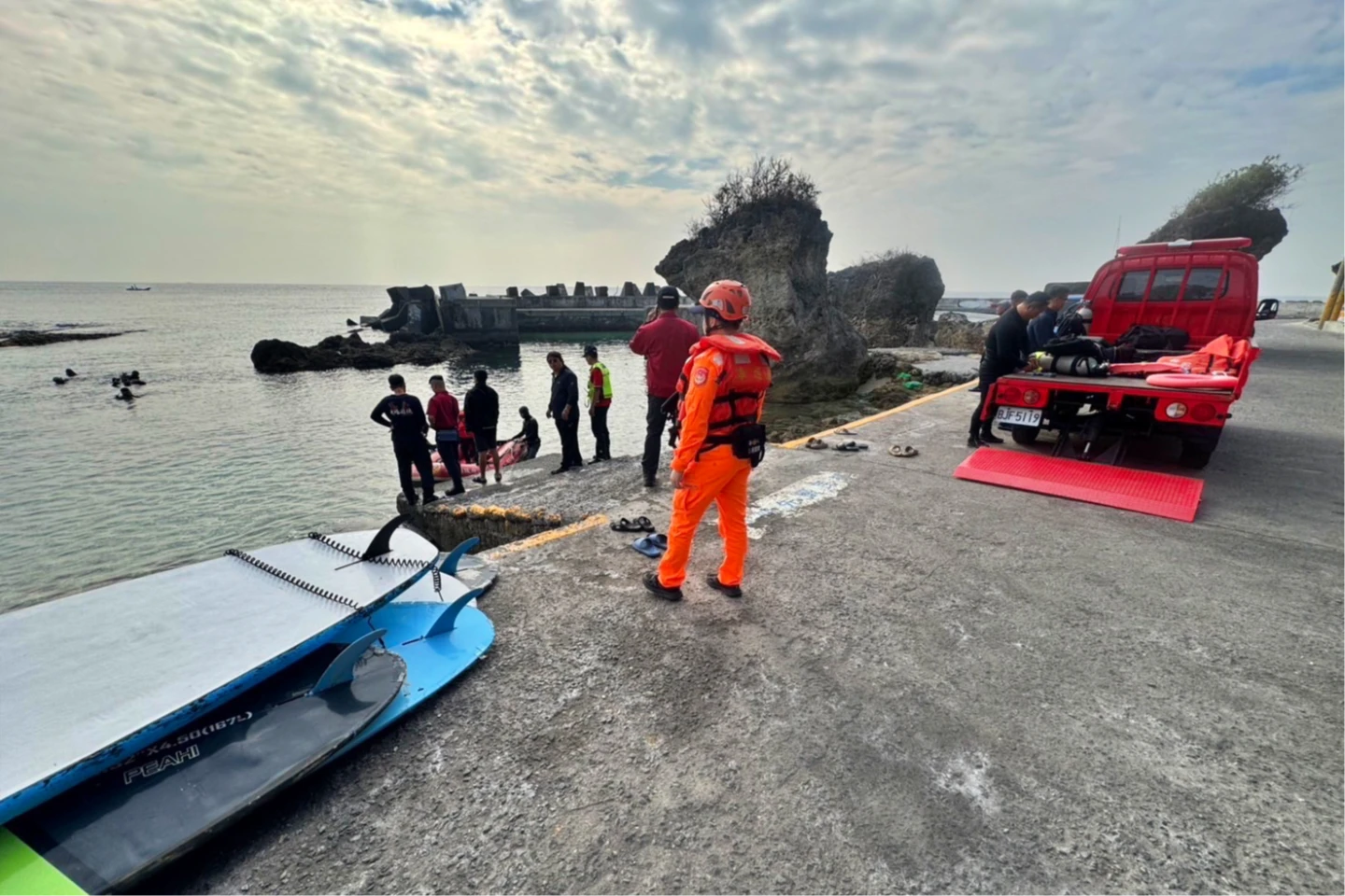 今日上午8時,消防局琉球分隊出動4車5人1艇、22名義消;海巡署則派遣岸際5車11人、海上2艇14員,持續針對大福漁港周邊及外海進行陸海空搜索,希望能盡快傳回好消息。