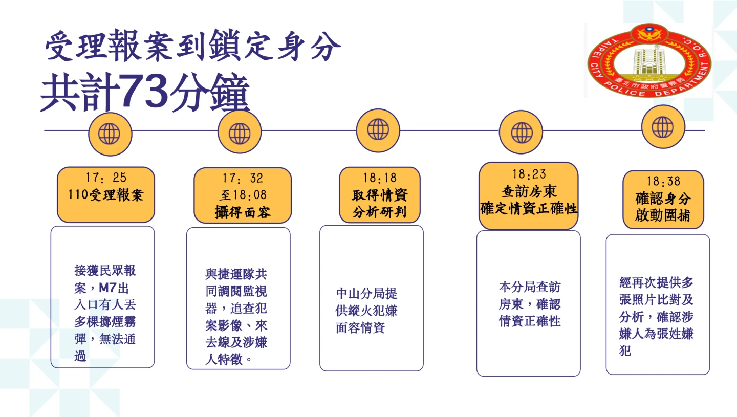 張耀仁指,中山分局偵查隊長於18時11分,從新聞上看到捷運台北車站M7出口有人丟擲煙霧彈,研判嫌犯特徵和縱火嫌犯相似恐有關聯,於18時18分將情資分享給台北車站轄區中正一分局,並向刑大隊長報告,前往查緝犯嫌。