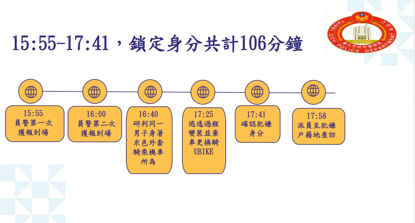 中山分局指出,從17時25分到17時41分確認嫌犯身分,鎖定身分共計花了106分鐘,全案困難處在於,張文事先勘查地形熟悉路線,且犯案後快速逃逸、2度變裝、更換交通工具拖延調查,且3處縱火地點無法聯想到跨區犯案。