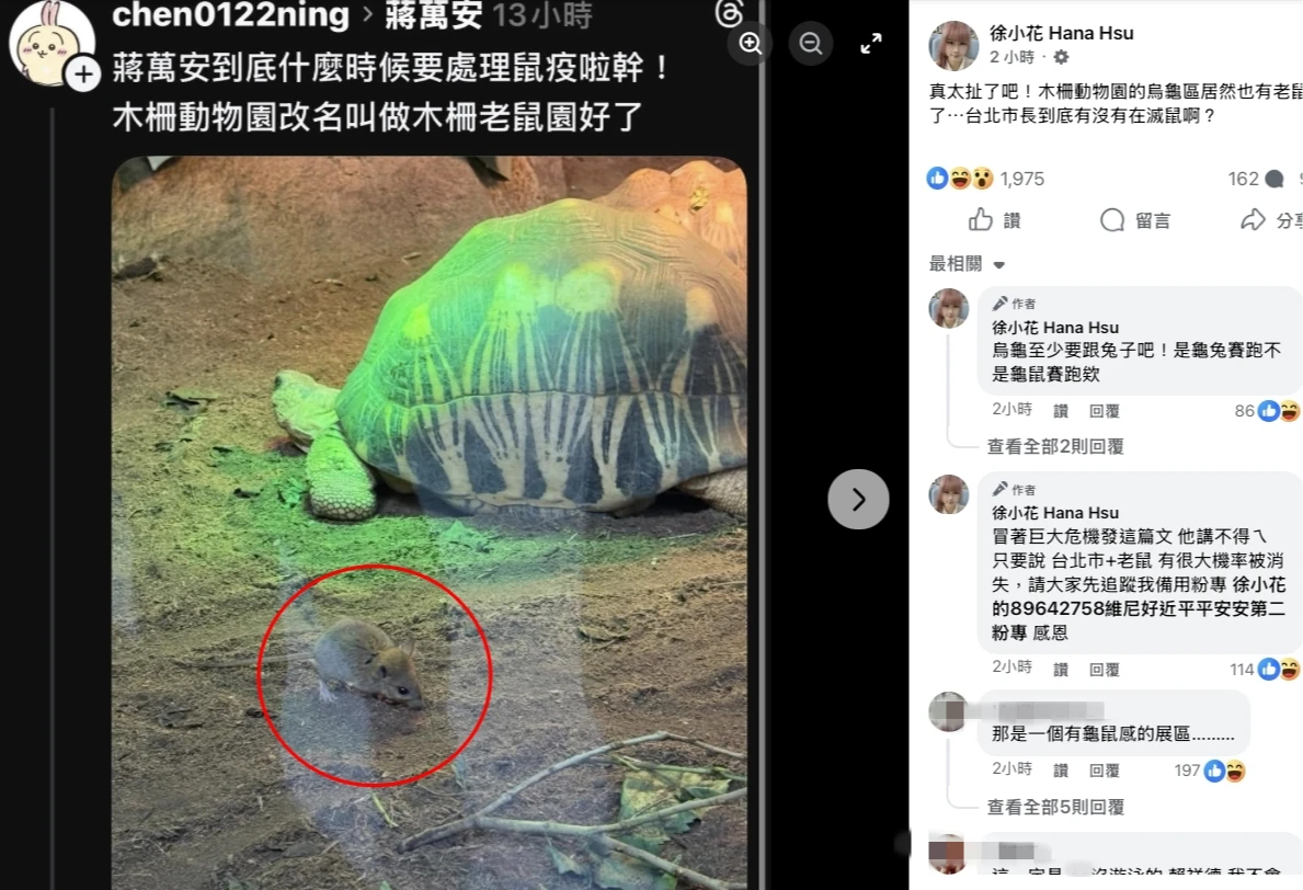 有網友於4月26日在社群平台貼出照片,畫面中一隻老鼠竟大搖大擺地出現在兩棲爬蟲館的輻射龜展場內,與陸龜同框,而且老鼠還比陸龜更靠近櫥窗玻璃與遊客,比主角陸龜更吸睛。發文網友怒批「木柵動物園改名叫做木柵老鼠園好了」,並點名質問市長蔣萬安何時要處理?