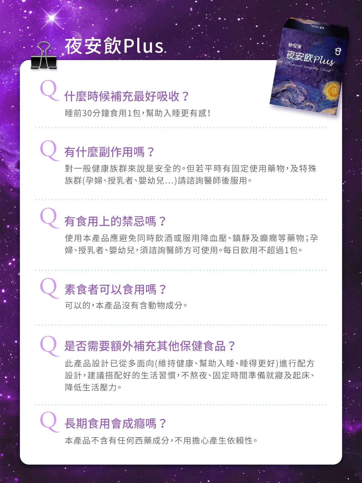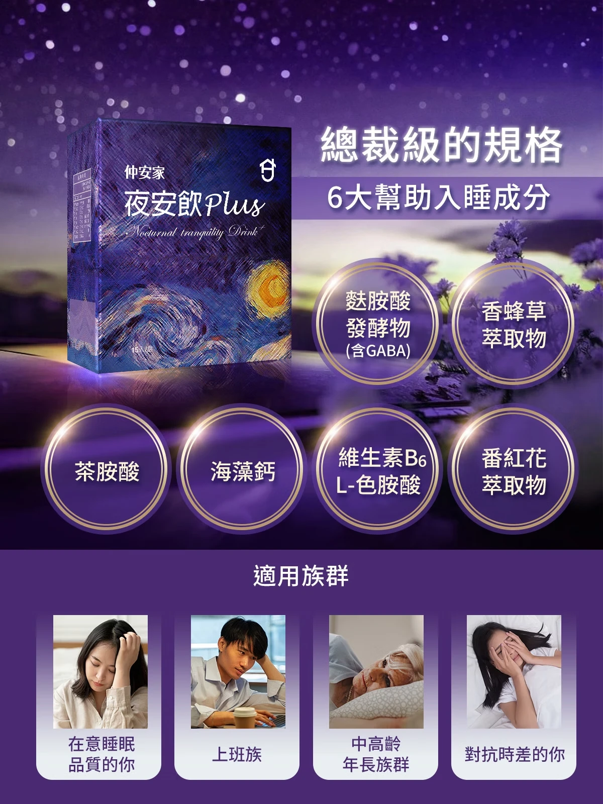 「仲安家夜安飲Plus」以天然草本配方為基底,能在不造成依賴的前提下,協助媽媽放鬆緊繃的神經,讓腦袋進入預備睡眠的趨勢,進入更深層的睡眠狀態。