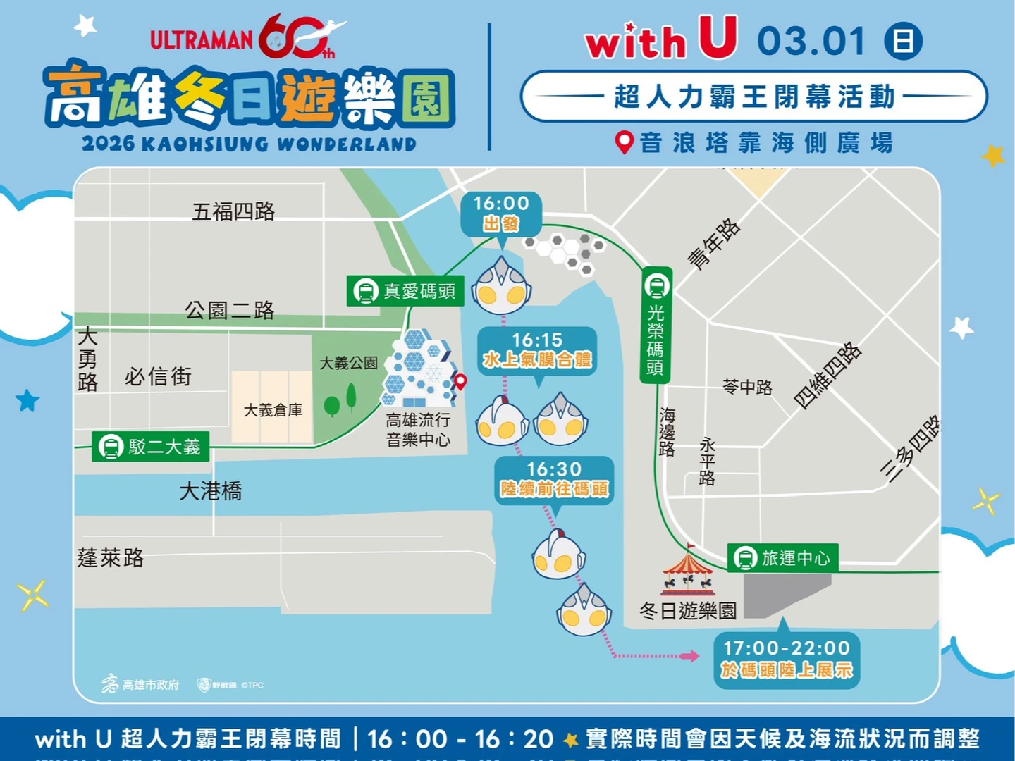 觀光局說,自活動開幕以來,兩尊15公尺高的超人力霸王迪卡、初代超人力霸王裝置矗立高雄港灣,成為冬日遊樂園重要象徵。為配合3月1日「With U」閉幕活動,超人力霸王迪卡、初代超人力霸王及8米高Q版氣膜的靜態及動態展示時間將有異動。