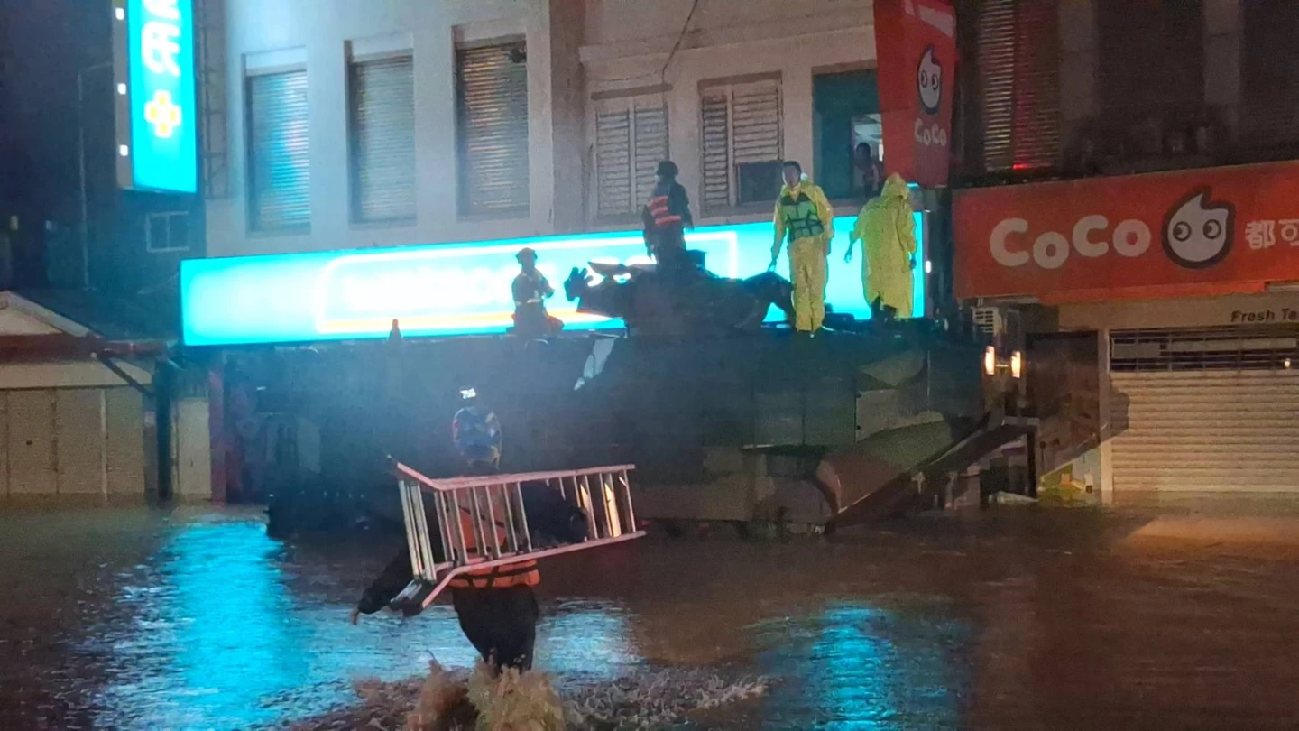 受颱風鳳凰外圍環流及東北季風共伴影響,昨夜蘇澳鎮豪雨成災,低窪處水淹最深則達1層樓高,軍方在暴雨中出動AAV7兩棲戰車、偕同消防救生艇深入積水處,警消也全力展開救援。