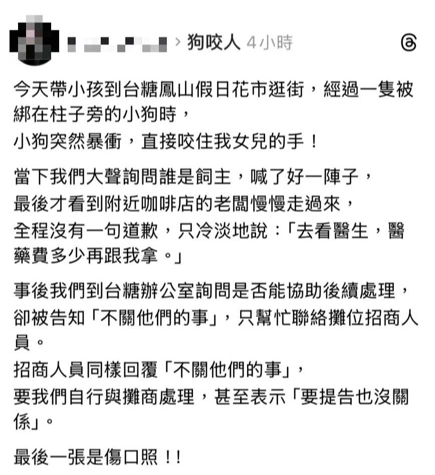 女童父親陳姓男子指出,小孩被咬到的當下,飼主始終沒有一句道歉,態度也相當差,讓家長難以接受。他強調,身為父母要的不是錢,而是飼主能正視問題、確實改善管理,並給出誠懇的道歉。然而,飼主雖口頭表示願意賠償,卻直到家長報警、警方致電聯繫後,才真的表達賠償意願。