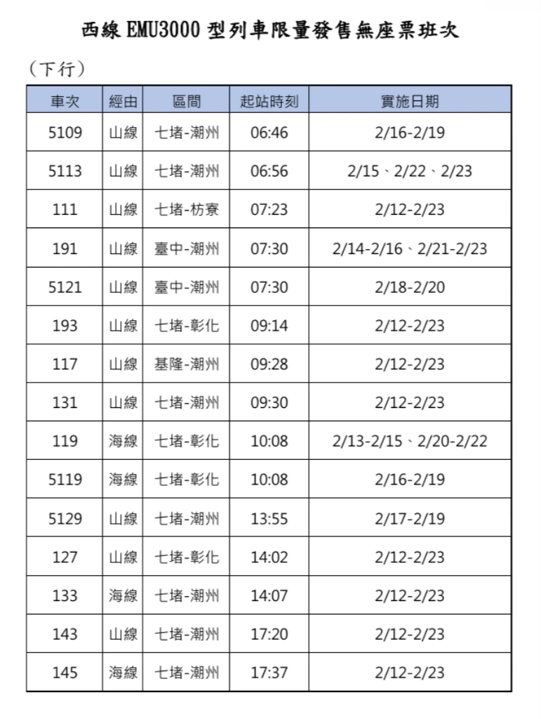 台鐵指出,115年春節疏運期間(2/12-2/23)西部幹線EMU3000型列車暫停自由座服務,改於乘車當日限量發售250張無座票(禁止進入6車),旅客可經由官網訂票,車站窗口、自動售票機取票或使用「台鐵e訂通」APP 取票。