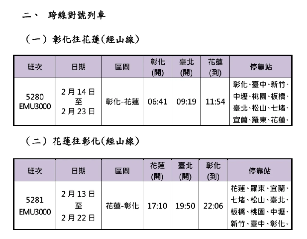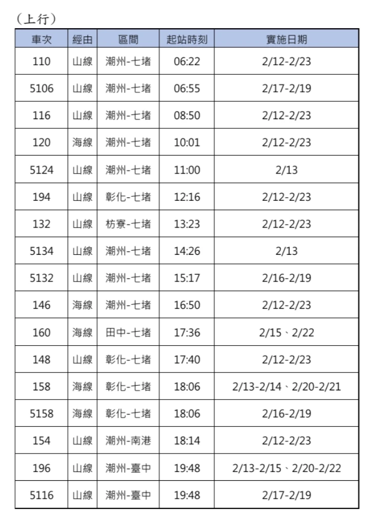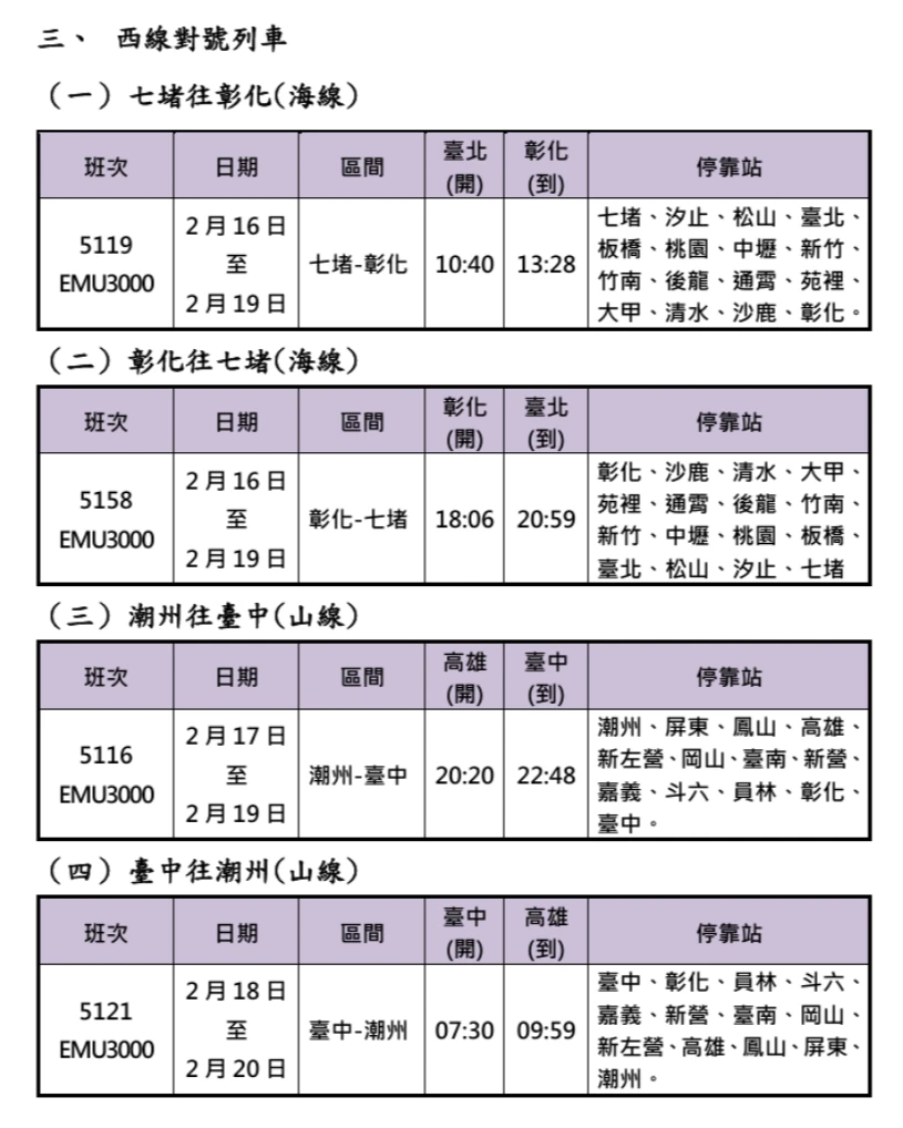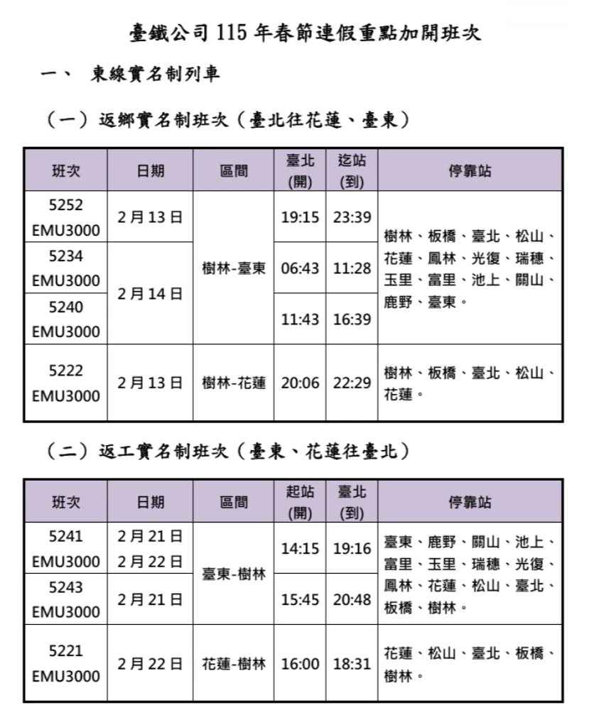 台鐵說明,春節假期115年2月12日起至2月23日全線加開各級列車271班,包含東部地區實名制列車8班、彰化-臺北-花蓮EMU3000型自強號列車20班、臺北-高雄-臺東EMU3000型自強號6班、七堵-彰化(海線)EMU3000型自強號列車8班、臺中-潮州EMU3000型自強號6班;另為加強疏運旅客,115年2月12日至2月23日暫停發售親子車廂車票,改以一般車廂方式售票。