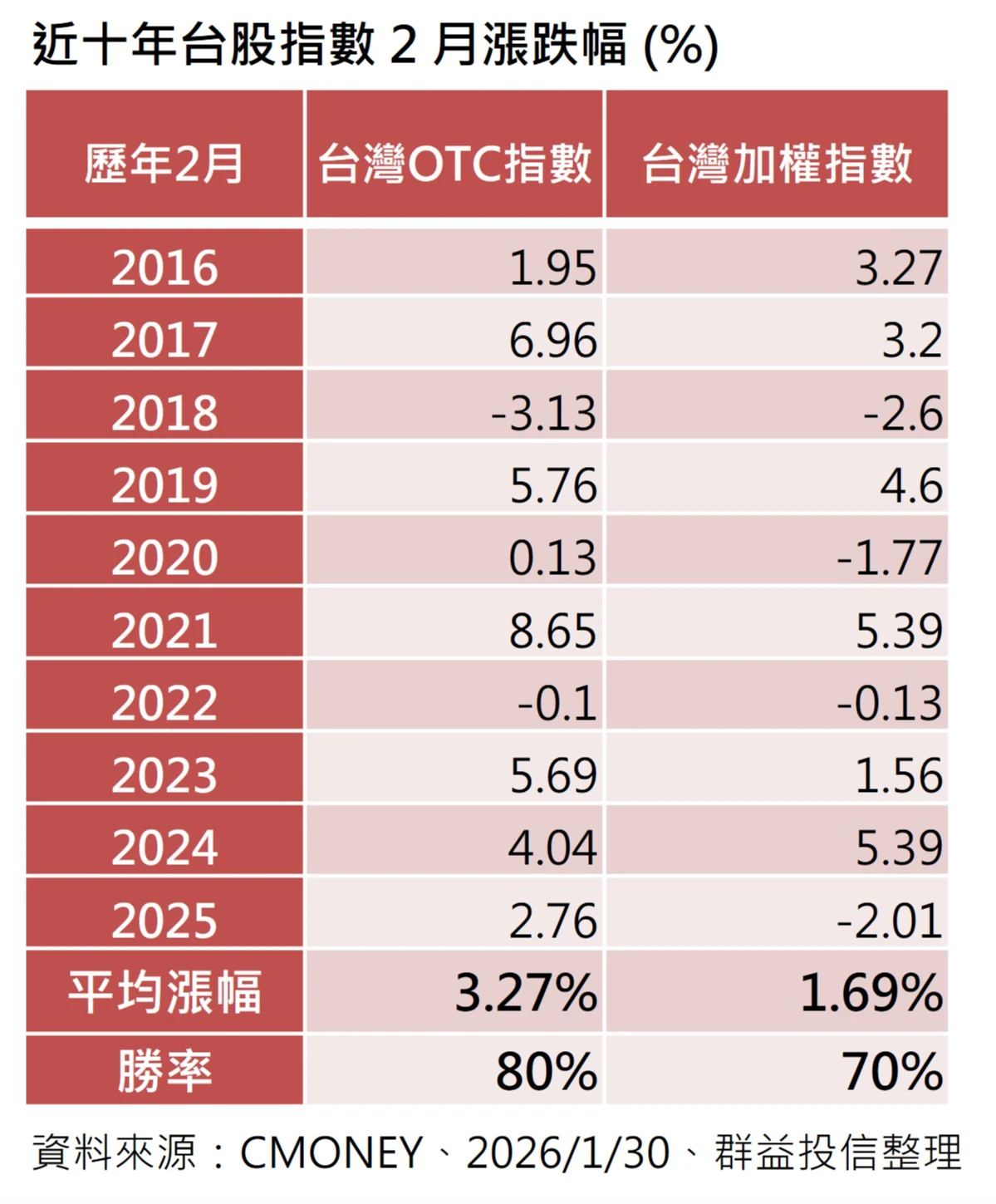 【記者吳珍儀/台北報導】進入2月,根據群益投信統計資料顯示,近十年歷年2月台股平均表現都是正報酬,其中大盤平均上漲1.69%,OTC指數平均上漲3.27%表現出色,投信法人表示,台股農曆年後在紅包行情預期下,台股量能可望進一步增溫。