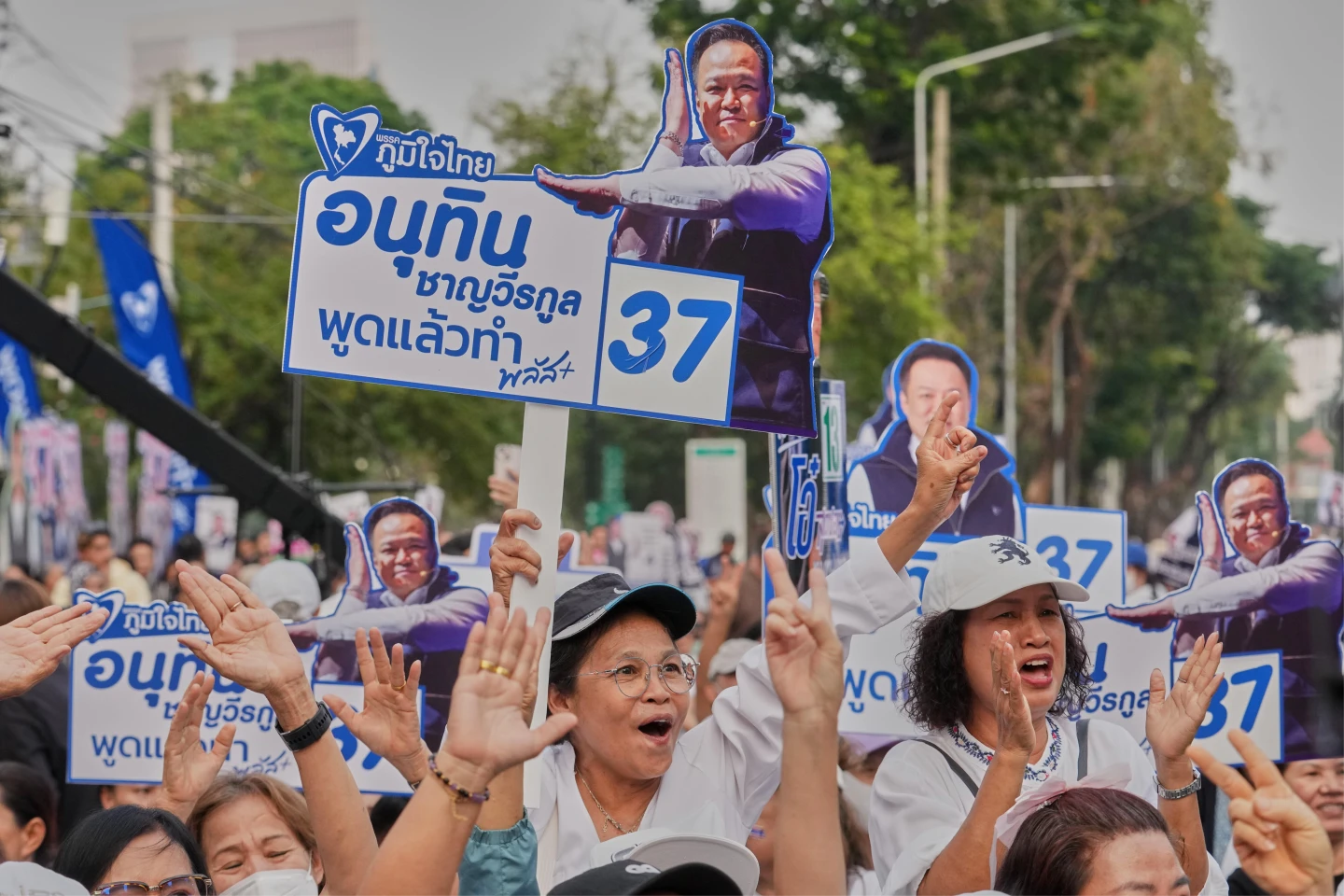 泰國總理阿努廷的支持者,熱烈參與造勢活動。美聯社