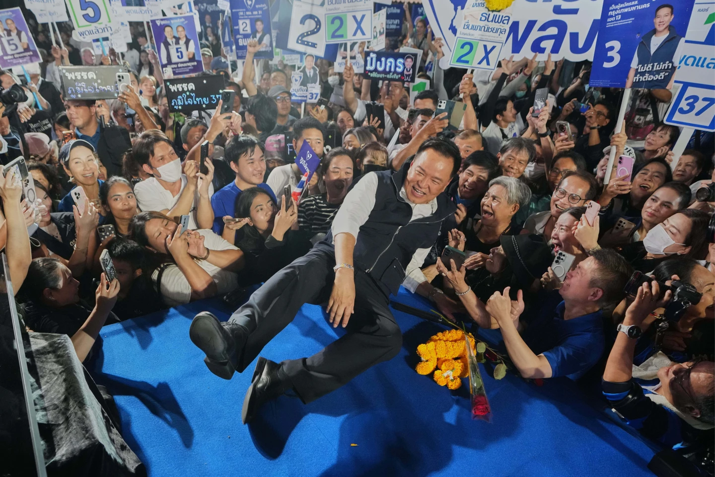 泰國總理阿努廷1月30日在曼谷造勢,與支持者互動。美聯社