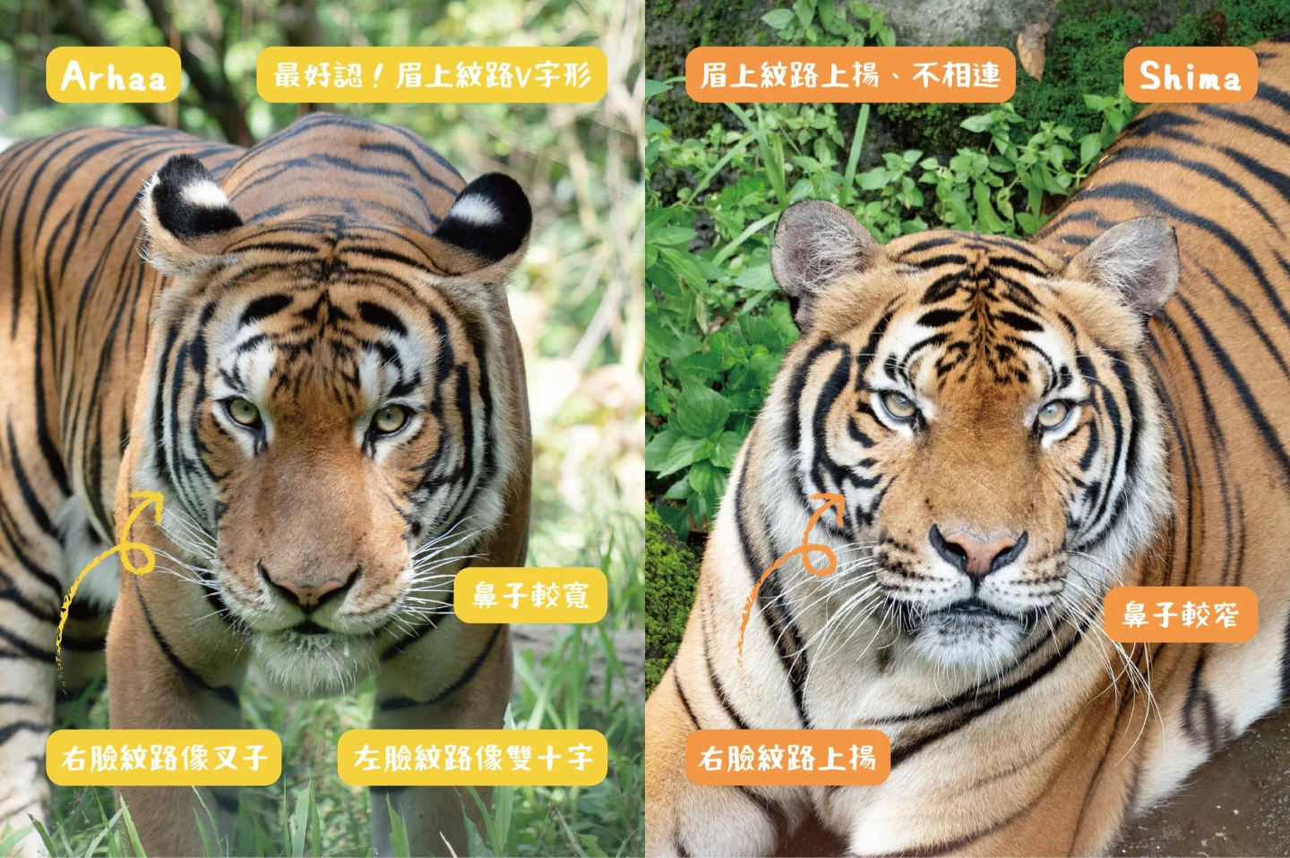 目前馬來虎「Arhaa」和「Shima」是「輪班制」,會輪流出現在台北市立動物園熱帶雨林的戶外場。而分辨兩隻馬來虎的方法:頭頂花紋紋路較對稱且中心線清晰的是「Shima」,「Arhaa」則是有對像是眉毛般的黑色短勾紋路。